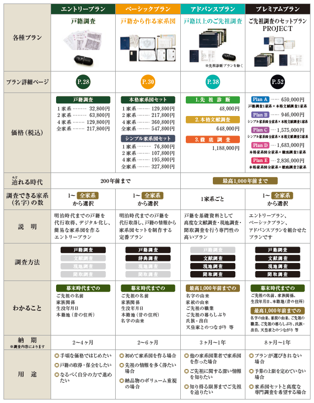 単純に戸籍取得を委任するプランもあれば、取得した戸籍から簡単な家系図を作成しそれをデータとしてお渡しするプラン、さらに代々残るような形で家系図や他のコンテンツをお渡しするプランなど豊富なラインナップがあります。