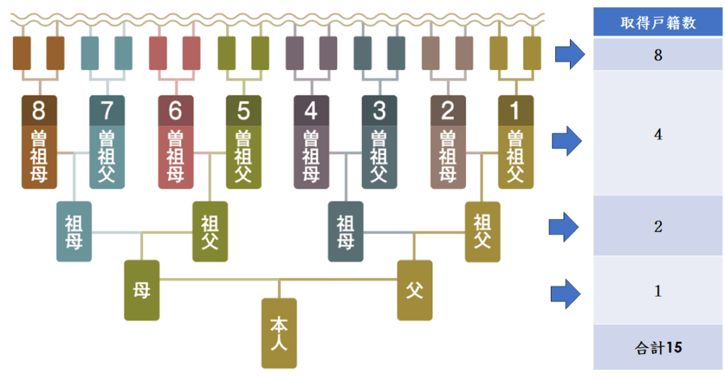 もし全家系の戸籍を取得するのであれば、15の戸籍を取得する必要があります。